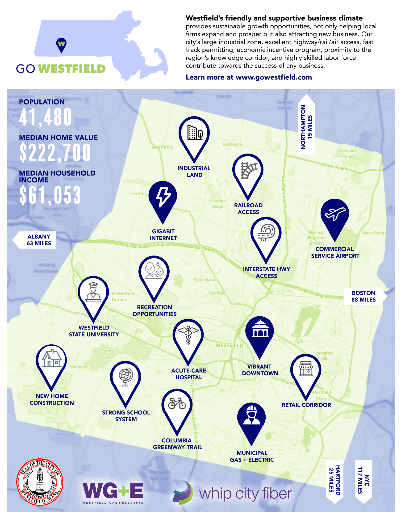 From greenfield development opportunities to urban infill, Westfield can accommodate all property needs. Within its 46 square miles, Westfield provides an established environment where manufacturing, distribution, retail, hospitality, and all kinds of businesses can be accommodated.